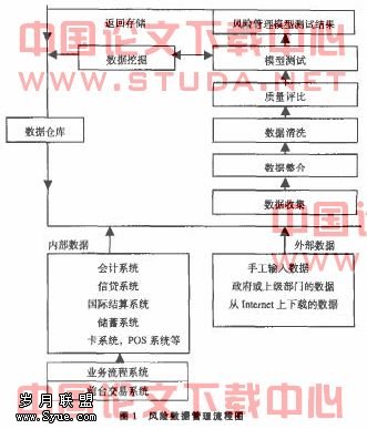 数据收集即从源头抓起。银行应成立专门的风险数据管理部门,对各部门原始数据进行广泛、及时的收集,并且从前台业务处理到后台报表、数据利用.进行统一管理。所收柬的风险数据主要包括内部数据和外部数据两类。内部数据来源于银行的客户分析系统、财务系统、信贷管理系统、资产负债管理系统、国际结算系统、储畜系统、卡系统,POS系统等;外部数据主要源于手工输入的数据、政府耿上级部门的文件、从Internet上下载的数据。