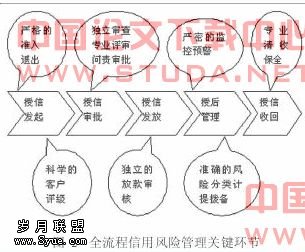 在风险管理流程方面,应结合国际通行经验和的实际国情,制定行之有效、监控到位,包括授信发起、授信审批、授信发放、贷后管理、授信收回在内的风险管理流程。在授信发起环节,通过“项目库”和客户信用评级严格授信准入管理;在授信审批环节,通过独立的尽责审查、民主的授信评审、严格的决策纪律和问责制有机结合,保证授信决策的科学有效;在授信发放环节,由独立的授信执行部门负责放款审核;在授信收回环节,由专业的资产保全队伍进行催收、核销。对于零售授信客户,区别不同产品实施不同的审批模式。对于风险相对较低的个人消费类贷款和小金额个人经营类贷款,可由零售贷款中心进行审批;对于大金额的个人经营类贷款和全部法人类零售贷款,按照公司客户授信审批程序执行。