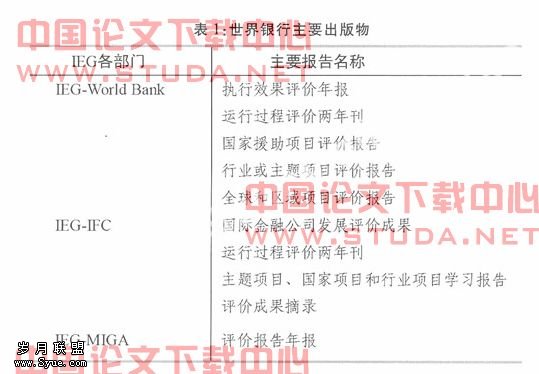 1 出版物——每年IEG都会将后评价成果以各种报告的形式进行上报和公开发行,世行的出版物通常按照评价组织三部分进行分类,表1给出了世行有关后评价成果的主要出版物。