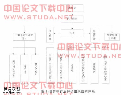 早在1970年世行就建立了相对独立的业务评价组织,评价工作受执行理事联合审计委员会监督。1973年“业务评价局”(Operation Evaluation Depart-ment,简称OED)成立,业务评价局与其他业务部门完全独立,不受外来干扰,独立地对项目执行情况做出评价,只对执行董事和行长负责,将信息直接反馈到世行最高决策机构。通过逐步,现在世行的后评价组织改名为独立评价组(Independent EvaluationGroup,简称IEG),IEG也是世行中的一个独立组织,该组织主要包括三个部分:世界银行独立评价小组(IEG-WorldBank)、国际金融公司评价小组(IEG-IFC)和多边投资担保机构独立评价小组(IEG-MIGA),这三个部分分别负责世行集团相应项目的后评价工作,世行后评价的组织结构如图1所示 (Thc World Bank,2008)。
