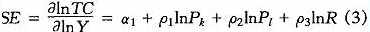 应用 Eviews3.1软件,经过多次迭代,得出检验结果在 10%置信水平下都是显著的。根据公式(3)得出如下的规模经济(SE)弹性系数的计算公式: