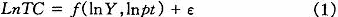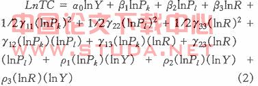 其中:TC表示总成本,y表示商业银行的产出,只 表示第i种投入品价格。 把商业银行的产出定义为贷款和投资,用 y表示贷款和投资的总和,将投入定义为资本、劳动及存款,他们的价格分别用R表示。则超越对数成本函数可以表示为: