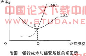 假定银行主要经营存贷款业务。在图中,横坐标表示银行的营运规模,即机构网点规模所能收的资金量;纵坐标表示银行的成本价格,即银行存款和平均利率与费用支出成本。图中的LAC为长期平均成本曲线,LMC为长期边际成本曲线必将经过其最低点E。LAC、LMC曲线描述了成本与规模的关系,如图所示:在经营规模小于OQ阶段,边际成本小于平均成本,平均成本随着经营规模的扩张而趋于下降;相反,在经营规模大于OQ时,边际成本大于平均成本,平均成本随着经营规模的扩张而趋于下降。最低的长期平均成本发生在经营规模为OQ点上,由此可以知道,银行的最适规模为规模OQ。
