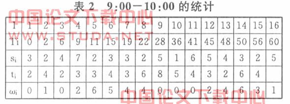 以大学城某银行营业厅为例,根据统计资料,顾客到达的频率与时间段有关,一般在9:00-10:30和下午2:30-4:00顾客到达率比其它的时间高。我们把时间分成两段,考虑8:00-9:00、9:00-10:00的情况,分别代表了一般情况和繁忙时的情况。其中,顾客编号i,到达时间Ti,服务时间si,到达间隔ti,排队等待时间ωi。具体数据见表1和表2。