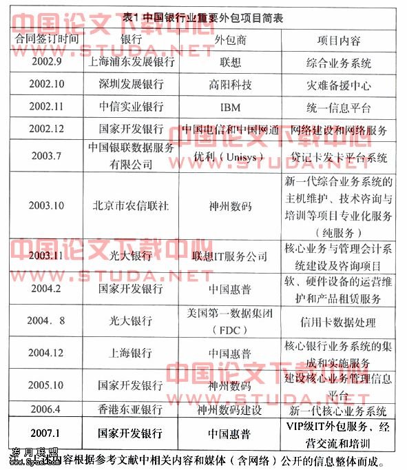 近年来,我国银行不断进行业务外包的尝试,但我国银行在这方面仍处于起步阶段,主要局限于IT相关业务、信用卡业务。表1了我国隐含的重要外包项目。