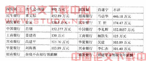 (一)薪酬激励问题。长期以来,我们对银行高管人员采取的是行政性的官本位手段,市场化的激励约束手段运用相当不足,导致高管人员具有很强的道德风险。国有银行的高管人员虽然身居高职,但是却无法获得与同级别的私有银行高管相当的年薪,心理上的不平衡是导致他们违反法规的重要原因。下面,我列举了一些上市银行的高管年薪数据: