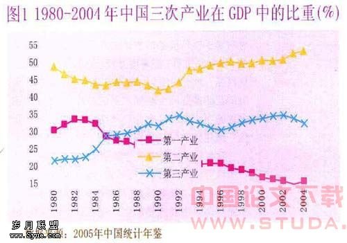 经济服务化是国际上已经出现的发展现实,并有其必然性。我国是发展中国家,经济发展在整体上处于工业化阶段,80年代以来服务业发展较快、第三产业在GDP中的比重有较大上升,由80年代初的20%左右上升至2004年的34%,劳动力占比也由13%上升至31%。然而总体来看,第三产业的增长速度仍低于工业,在国民经济中的比重仍较低。从整个上看,我国尚处于工业化阶段,工业仍是国民经济的主导部门。