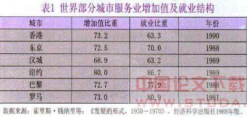 贝尔等人的理论引起世界性的广泛关注,而国际经济发展的现实则为其提供有力的验证:当今世界经济中的一个显著现象就是,服务业在各国经济发展中的地位逐年提高,无论从服务业增加值占GDP的比重,还是从服务业就业占总就业的比重看,服务业已经成为经济中最具发展潜力的领域。统计数据显示,1999年世界范围内服务业增加值占全球GDP的比例已从20世纪70年代早期的50%上升到64%。在发达国家,服务业增加值占GDP的比重已超过70%。中等收入国家和低收入国家的这一比例分别为55%和44%。在一些主要城市,这一数字达到了70-80%。与此同时,服务业吸纳的就业人口占总就业人口的比重,发达国家为60-70%,中等收入国家在45-60%,低收入国家也达到30-40%。