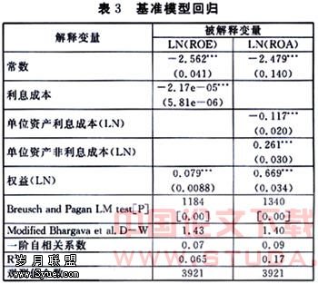 由于解释变量利息成本和非利息成本数据以及其他银行的资产数据之间的存在一定程度的相关性,因此在具体处理时,我们采取只选其中一个成本指标的方法来尽量避免解释变量之间的相关性。此外,在对资产收益率(ROA)进行解释时,我们把成本变量、资本变量以及其他银行的资产变量都进行了标准化处理,即把他们都除以银行i的资产规模,同时所有这些解释变量也都进行了对数化处理。