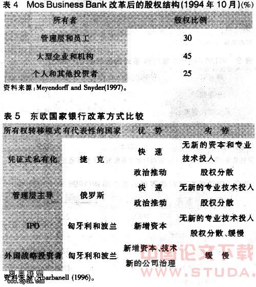 东欧国家在基本完成对不良贷款问题处理后,便开始了国有银行私有化和重建公司治理的改革,旨在建立一个健全、有效率的银行部门。其方法包括凭证式私有化。公开发行上市、引入战略投资者和管理层主导的私有化或管理者收购(MBO)。