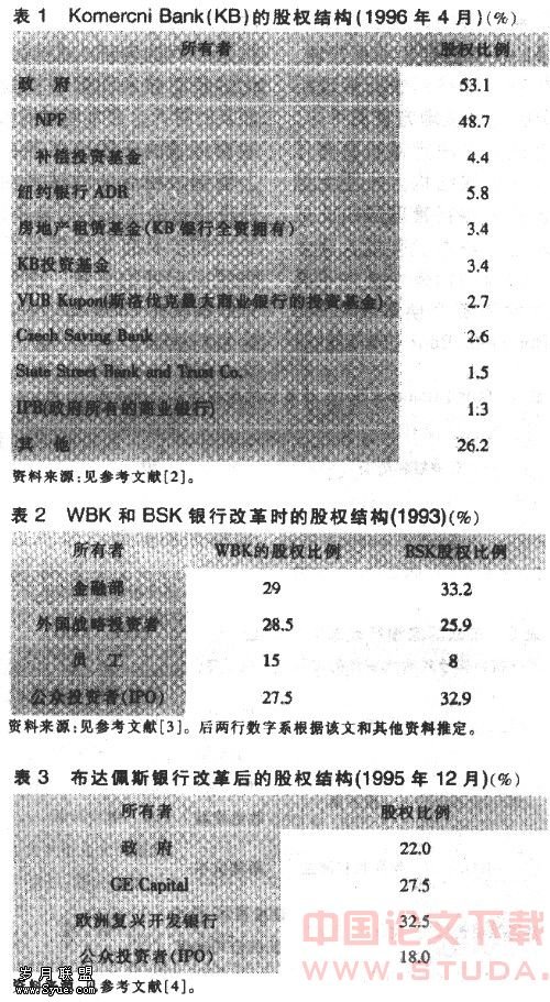 1.从东欧国家的经验看,政府继续控股银行似乎不能建立真正的治理结构,也不能有效改善银行绩效。LaPorta等发现国有银行经营业绩比不上私有银行,而国有银行在低收入的发展中国家普遍存在。国有银行经营业绩的劣势有许多原因,其中政府干预、公司治理以及竞争不足等问题是主要原因。按照这些研究的观点,国有银行私有化后业绩普遍应该提高。但捷克等国家通过凭证将银行私有化后,发现经营业绩并没有提高,原因就在于凭证式私有化使银行股权分散,监督成本与收益的不对称使小股东的“搭便车”行为成为“选择”,转型经济体中资本市场又不像美国那样发达,市场的资源配置功能和监督功能远未发挥足够的作用,因而分散的股权结构没能改善银行的公司治理。而政府在这些私有化的银行中仍占有较大比例的股份(30%),银行的管理层也主要来自国有银行的管理者和政府官员,这就为政府继续干预银行经营创造了条件。而且在限制新银行进入的金融管制政策下,私有化银行继续享受竞争不足的垄断租金,银行管理者和政府官员成为内部控制人,因此即使银行实现部分私有化,但政府干预。公司治理和竞争不足的问题并未真正解决,这就是东欧国家在第一轮改革后银行绩效并未改善的原因。说明在转型经济体中,由于市场约束的机能不具备,国有银行在保持政府控股并依靠引入战略投资者、私有化和发行上市的政策无法奏效,因而银行改革的中心任务似乎应该是逐步降低国有控股比例,以真正改善公司治理;而且私有化等股权改革方式和放松管制、促进竞争的措施必须围绕公司治理进行。