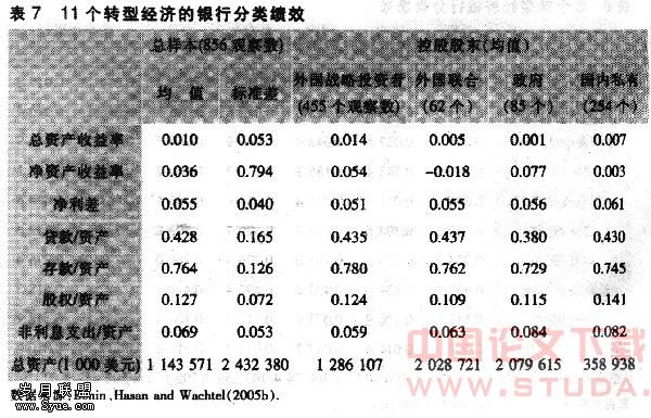 Bonin、Hasan和Wachtel用随机边界分析法(SFA)对保加利亚,捷克、克罗地亚、匈牙利、波兰和罗马尼亚6个较典型的转型经济进行比较,这6个国家至2002年超过75%的银行资产为外国所控制:作者统计了这6个国家67家大银行(如在各自国家资产处于前10名)在1994—2002年的451个观察数据(主要是1997年后的数据,1994—1997年的不到20%)。样本银行被分成外资新建(指跨国银行的分行,占24.4%)、国内新建(16.6%)、国有(27.7%)和私有化银行(由原国有银行私有化而来,31.3%)四类,其中由战略投资者控制的银行占总样本的23%(不含外资新建银行),私有化银行类别中74%由一个战略投资者控股,这一数据不同国家有所区别(对保加利亚、克罗地亚和波兰超过了80%,匈牙利是72%,罗马尼亚推动时间较晚也有50%,捷克是在凭证化基础上后来再对外资出售的,有43%)。