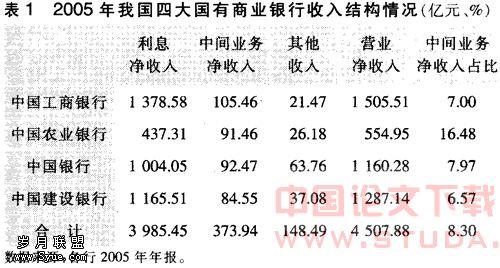 四家国有商业银行的收入主要来源于贷款利息,利息收入占总收入的84%左右,而中间业务收入仅占9%左右,中间业务收入对营业收入的贡献与国际先进银行相比差距较大。