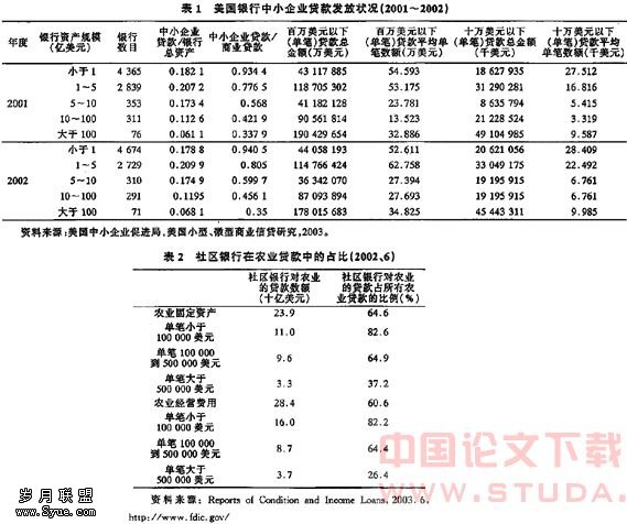 从表1可以看到,资产规模小于10亿美元的社区银行,对于中小企业的贷款占其自身资产的比重都超过了17%,最高的达到了20%,而大银行的该比重都在12%以下,资产规模超过100亿美元的,该比例甚至仅为6%。银行中小企业贷款占整个商业贷款的比重也随着银行资产规模的增大而逐渐减少;资产规模在1亿美元以下的达到了93.44%?,资产规模在1~5亿美元的也达到了77.65%?。这两个层次的社区银行达7 204家,占社区银行的绝大多数。而资产规模在100亿美元以上的大银行对中小企业的贷款仅占商业贷款的33%。反映资产规模小的银行更愿意将资金贷款给中小企业。