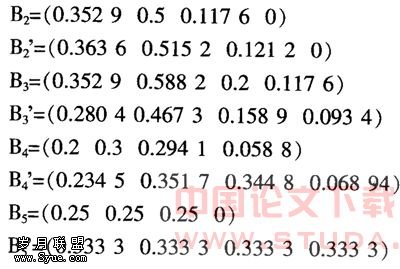 之后,再把得到的矩阵归一化: B1=(0.2÷0.635 3 0.2÷0635 3 0.176 5÷0.635 3 0.058 8÷0.635 3)=(0.314 8 0.314 8 0.277 8 0.092 6)