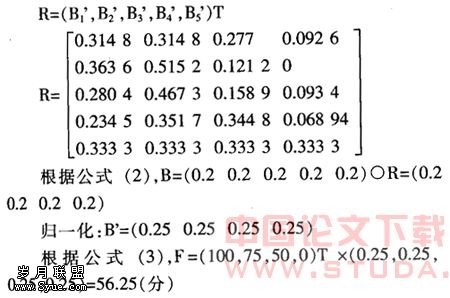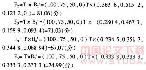 3.构造向量T,把运算结果转换成分数表示。构造向量T=(100,75,50,0),T与模糊数学综合评价矩阵B’(B归一化处理后的矩阵)相乘,便得到分数形式的评价结果F。计算公式为: