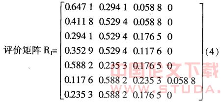 4.评价矩阵R。从U到V的模糊关系,用模糊评价矩阵R表示: