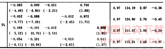 总体来看,各个方程的调整后样本决定系数(Adjusted R2)都接近于1,表明模型的拟合效果很好;F检验的值较大而其相伴概率均为0.000000,反映变量间呈高度线性,回归方程高度显著;D.W.值接近2,表明序列不存在自相关;此外,赤池信息量(AIC)较小,也表明模型的准确性等较高。