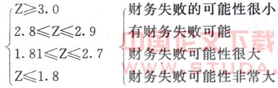 Altman教授通过对Z分数模型的长期研究提出了判断企业破产的临界值(z-score)。研究发现,Z值越低,该企业遭受财务失败的可能性就越大;Z值越高,该企业遭受财务失败的可能性就越小。Altman曾经对66家企业进行分析测算,其准确程度达95%左右。Z分数模型的具体判断标准为如下所示: