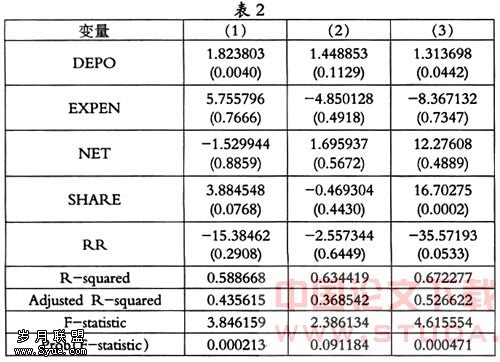 2、结果分析。我们用Eviews5.0对样本银行作固定影响可变截距检验,得到结果如表2。