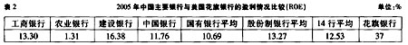 银行盈利能力评价的常用指标是资产利润率(ROA)和资本收益率(ROE)。表1和表2是我们根据相关数据的2005年我国14家主要商业银行②和美国花旗银行的盈利情况比较,使用的分别是ROA和ROE两个指标。