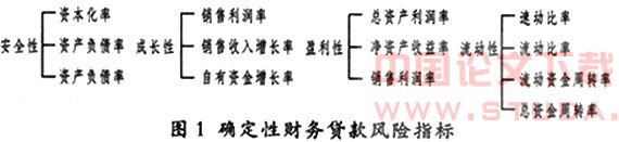 银行对企业贷款的风险评价因素指标分为确定性的财务指标和非确定性的定性指标,非确定性的定性指标有信用指标(包括企业品格、企业经营能力、经营领域、企业管理水平和行业趋势)和外部因素(包括政策异向和行政干预)。确定性指标内容参见图1,这些财务指标不一定全纳入评价贷款风险,因时因地制宜。