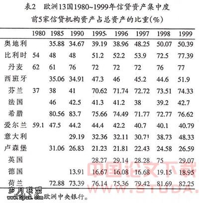 可见,中国商业银行市场集中度仍将会有一个下降的过程,但是这种下降不会一直持续下去,随着中国经济金融市场化程度的不断提高,宏观调控由直接向间接方式转变,下降的趋势可能会发生扭转,这种扭转主要体现在三个因素上:国有商业银行效率的提高;利率市场化赋予大银行以更有效的定价策略进行竞争;大银行对中小银行的并购。但是这种由下降到上升的过程持续的时间难以确切地预知,它将取决于中国经济金融市场化的深度与速度。这一趋势也符合国际银行业在纵向上的发展。Tschoegl(1982)发现20世纪70年代所有国家的银行集中度都下降了。Bayer and Mote(1985)调查了加拿大、法国、德国、日本、英国和美国在1930-1980年期间的银行业集中趋势,发现加拿大、德国和英国的集中度下降了,日本的变化不大,而美国、法国有所上升。Steven J.Pilloff(2004)发现美国最大10家银行资产和负债集中度分别从1980年22%和19%上升到2003年的46%和41%。以欧洲为例,结合Baver and Mote(1985)的研究可以发现1930-1999年间英国和德国银行业集中度经历了较为明显的由下降到上升的过程,与此相似,这种趋势可以在比利时、法国、希腊、爱尔兰、卢森堡等国集中度发展过程中得到证实(参见表2)。因此,结合国际银行业的发展规模,可以认为中国商业银行市场集中度必将经历一个由分散到集中的过程。