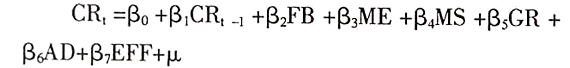 CRt和CRt-1分别表示当期和上一期的市场集中度,取中国最大的四家国有商业银行各年的资产、存款、贷款和净利润集中度的平均值而得。通常认为两者成正相关关系,原因在于传统S-C-P范式表明集中度与银行绩效之间往往存在正相关关系,将会导致集中度进一步增加,另外,在位银行往往能采取定价策略阻止新银行的进入从而增加集中度,在相反的情况下,期初集中度与当期集中度之间则呈现一种负相关关系。