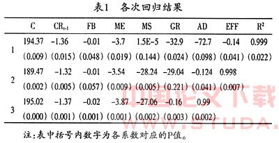 通过对上述模型的第一次拟合,发现拟合优度极高,并且以较小的P值通过了F检验,但是MS,AD变量均没有通过5%的显著性水平检验。极高的R2(拟合优度)值和较小的P值意味着可能存在多重共线性的问题,因此,在剔除t值较小的MS变量后,进行第二次回归,发现AD项仍没有通过显著性检验,于是,在剔除AD项后进行第三次检验,发现总体的拟合优度很高,F检验显著,并且各个变量都通过了5%的显著性水平检验(回归结果见表1)。