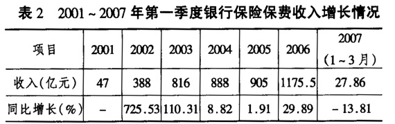 正是由于我国银行保险自身存在上述的问题,使得我国银行保险的发展经历了一条“起步——辉煌——调整”的过程。辉煌时的2003年,银行保险业务与团体保险、个人保险三足鼎立,成为中国人身保险产品的三大销售渠道之一。然而进入2004年以后,事情似乎悄然起了变化,2004年银行保险业务占总保费收入的比例下降了0.5个百分点,2005年这一比例继续下降,下降比例达到近3个百分点,一些保险公司主动收缩了银行保险业务,银行保险的发展进入了调整期。2006年刚刚有所恢复,2007年第一季度又出现了负增长(见表2)。
