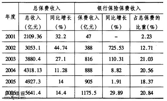 银行保险能够帮助银行和保险公司实现业务的多元化,避免过度依赖单一业务带来的收入波动,而且,通过银行保险业务可以实现银行和保险机构对自身资源的进一步利用。因此,自1996年银行保险开始登陆中国以来,特别是从2000年开始银行保险迅速成为我国重要的保险分销渠道,并与个人营销、团体业务形成三足鼎立之势。银行保险业的快速发展,大大促进了总保费收入的大幅度提高(见表1)。