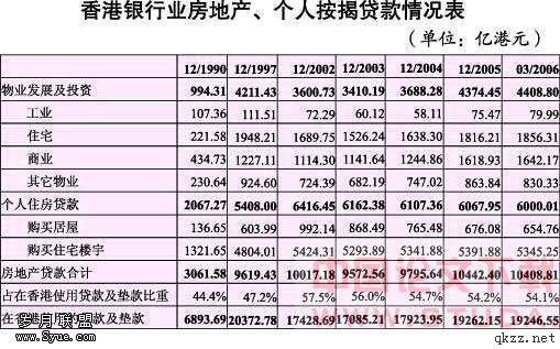 而,银行业靠房地产的发展而获利。香港银行业历来依靠房地产贷款解决其资金出路,90年代以后这种依赖有不断发展的趋势,至2006年3月,香港银行业物业发展及投资贷款达到4408.8亿元,个人住房贷款达6000亿元,房地产贷款在香港贷款总额中所占比重达到54%,这些数据甚至已远远超过1997年高峰时的水平(见下表)。