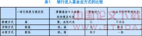 2、商业银行进入基金业的方式。银行是否能够成功地进入基金业与其所采取的进入方式有着很大的关系,其涉足基金领域的方式可谓多种多样,这些方式具有不同的特点。概括来讲,可分为以下三种方式:新建(start-ups/de novo entries)方式。这种方式指银行通过单独设立一家基金(分)公司或基金部门来进入基金业。采取这种方式的优点主要体现在银行可以完全控制新建立的基金公司,制定与本文化相适应的市场营销策略和激励机制。采取这种进入方式的缺点在于新建一家基金公司通常需要较大的投资,新公司可能缺乏经营基金业所必需的专业人才与经验,而且通过新建方式进入基金业取得客户的认同需要一定的时间。并购(mergers and acquisitions,M&A)方式。并购方式是指银行通过收购现有的基金公司或与基金公司进行合并来进入基金领域。该方式的优点主要体现在银行可以完全获得并依靠基金业的专业人才及其所拥有的经验来迅速进入基金业。通过这种方式进入基金业的缺点表现在合并后的银行与基金公司可能在企业文化、经营风格等方面存在显著的差异,要使二者真正融为一体可能需要较长的时间与成本。组建合资企业(joint ventures)方式。合资企业是指由两个或多个公司共同出资建立的一个独立的法律实体,在这里,是指银行与基金公司共同出资建立一家经营基金产品的公司,由银行与基金公司共同控制、共享收益、共担风险。该种方式被采用的原因主要在于它可以避免通过新建或并购方式进入基金业所必须的巨额资金投入,因此对于那些规模较小的中小银行来讲是一种可行的进入基金业的方式。银行通过这种方式进入基金业存在的问题在于合资企业并不是一种稳定的组织机构形式,而且银行与基金公司对于银行基金的战略意图可能存在着分歧,这会引起不小的麻烦。