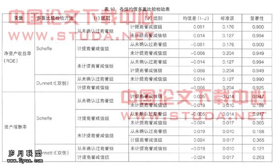 从表9可知,虽然方差分析显示三组上市公司的获利能力之间不存在显著性差异,但本文还是进一步采用了均值多重比较以进一步分析这三组上市公司之间获利能力的差异,均值多重比较的结果见表10。由于各组上市公司的数量不等,本文选用了Scheffe法,对所有的组合进行同步进入的配对比较。此外,本文还进一步采用了Dunnett法,指定未计提商誉减值组为对照组,然后将其逐个与其它组进行两两比较,并选择了双尾检验。