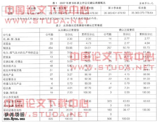 从表2可知,从交易所的分布来看,沪市确认商誉的上市公司达323家,而深市只有183家。在2007年度,确认商誉的上市公司分布甚广,囊括了上市公司的所有行业,但分布很不均衡。首先是制造业类上市公司确认商誉所占比重最高(占50.79%);其次是商品流通类上市公司(占8.1%);再次是综合类上市公司(占7.31%),超过6%的还有信息技术类上市公司(占6.52%),其余的行业都在6%以下。上述确认商誉的分布至少可以说明三大问题: