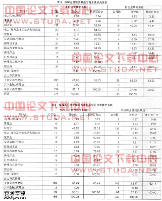 由于商誉的确认与计量相对比较复杂,上市公司需要一定的时间去学习和运用现行会计准则,本文假设2007年中期财务报告的编制是上市公司学习现行会计准则的过程。但2007年年报是经过审计的财务数据,我们有理由相信其公允性和可靠性。经过审计的财务数据包括了年初数和年末数,假定2007年里没有产生新的合并商誉前提下,其数理逻辑关系为:年初商誉数额≥年末。为此,本文再次将419家在年报中确认过商誉的上市公司分为年报符合逻辑关系组与年报不符合逻辑关系两组进行深入分析。这两组上市公司所属行业和上市地点情况如表6所示。