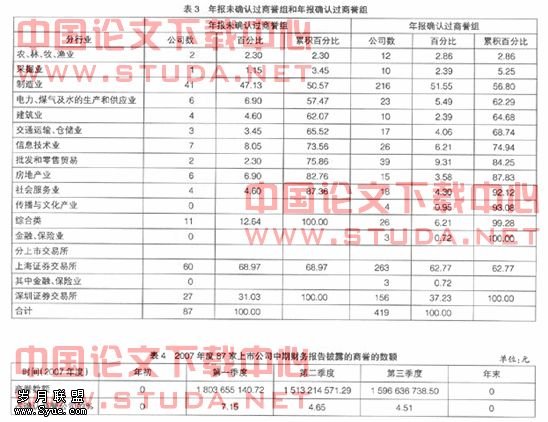 从表3和表4可知,上述87家上市公司在年度内确认过商誉,且数额达18亿元、15亿元和16亿元,而年初、年末的商誉价值为零。其可能的原因只有三种:一是上述公司在2007年度内发生了企业合并而产生了新的商誉;二是在年末全额计提了商誉减值损失;三是原会计记录存在差错,在年报前进行了差错更正。至于是何种原因导致的结果,还需进一步分析。