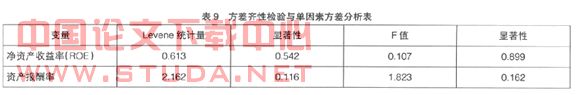 在进行方差分析之前,我们先探讨方差分析对商誉本质分析的适用性。方差分析一般需满足三个条件。其一是正态性,笔者通过P-P正态概率图,发现从未确认过商誉组、未计提商誉减值组的净资产收益率不太符合正态分布,但实际上方差分析对正态性的要求是稳健的,即正态性得不到满足时,方差分析不会受太大影响;其二是方差齐性,表8分别列示了净资产收益率、资产报酬率这两个变量的方差齐性检验,从表8可以看到净资产收益率、资产报酬率的双测检验概率分别为0.542与0.116,所以不能拒绝方差齐性的假设;其三是独立性,显然这个条件是满足的。所以,方差分析在此处是适用的。