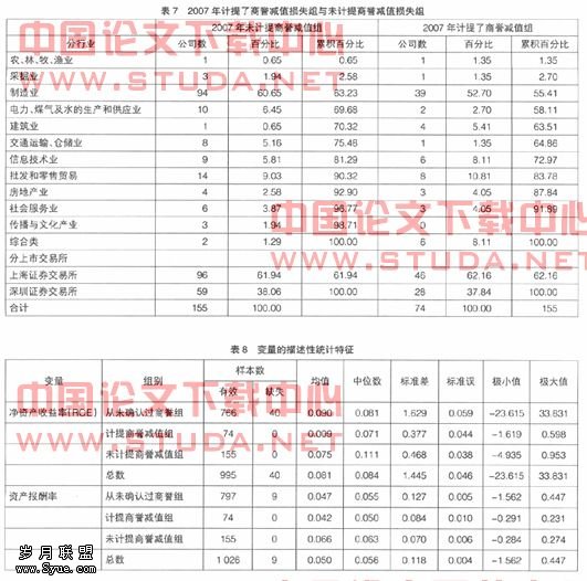 从表7可知,2007年,上述229家上市公司中有74家(占32.31%)计提了商誉减值准备,其中还有25家(占10.92%)全额计提了商誉减值损失,其余155家未计提商誉减值损失。也就是说,2007年期末还有204家上市公司拥有商誉。