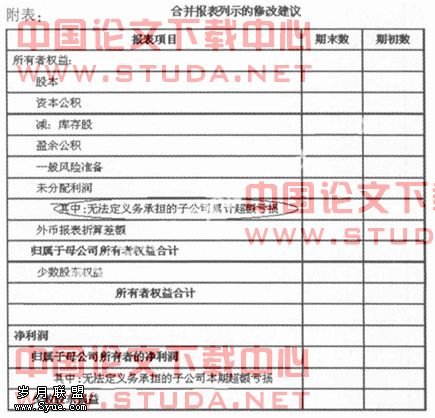 国际会计准则和我国企业会计准则虽然可以防止母公司进行利润操纵,但是从另外一个方面看,将子公司的超额亏损全额合并意味着母公司对子公司承担无限责任。这有悖于我国《公司法》关于母公司以其对子公司的投资额为限承担有限责任的规定。在母公司不承担资金输出或额外的债务担保责任时,这部分超额亏损可能永远也不会成为母公司的支出。新准则的这种处理,对于投资者、企业经营者来讲都是难以接受的,毕竟存在一部分报表使用人,更关心母公司控制下的法定权益和法定收益。因此,笔者建议对合并财务报表的列报格式进行适当修改,以满足不同报表使用人的信息需求。在资产负债表“未分配利润”下增加“其中:无法定义务承担的子公司累计超额亏损”,反映合并范围内资不抵债的子公司发生的累计超额亏损。在合并利润表的“归属于母公司所有者的净利润”下增加“其中:无法定义务承担的子公司本期超额亏损”,反映合并范围内资不抵债的子公司当期发生的超额亏损。笔者根据上述建议,对现行报表格式进行了修改,具体格式如附表所示。