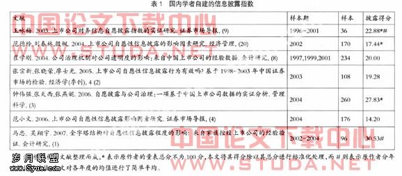 尽管证券监管部门自2000年后逐渐开始关注对上市公司自愿信息披露的引导与规范,但目前中国上市公司的信息披露依然以强制性披露为主,自愿性披露水平不高且意愿很弱。从表1列示的中国学者对上市公司自愿披露评分可知,若按满分100分,上市公司的自愿披露得分在14~31分之间。范德玲等(2004)在对中国上市公司的自愿性披露水平打分时发现在国外研究中包含大约100个二级指标的自愿性披露水平指标体系中仅有28个指标能用于对中国制造业上市公司的自愿性信息披露的评分,其余指标在中国目前的上市公司年报中尚为空白,而且未经总披露分值规模化的上市公司自愿性披露平均分值仅为4.88分,表明中国上市公司的自愿性信息披露程度极低。当监管部门2001年将公司首发时的盈利预测改为自愿披露后,上市公司披露意愿越来越弱(秦玉熙,2004)。