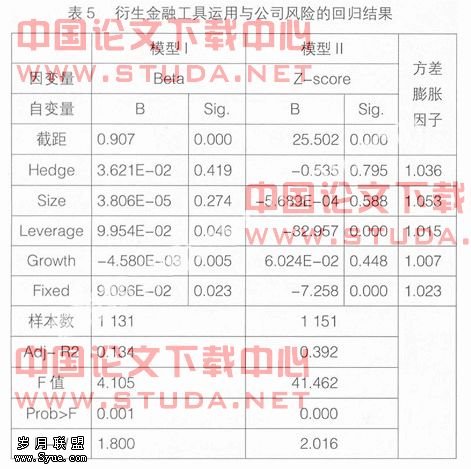 当以Z-score作为公司风险变量时,公司运用衍生金融工具进行风险管理的哑变量估计系数为-0.535,在10%的水平上不显著,可以认为公司运用衍生金融工具进行风险管理降低了公司的Z-score值,即对公司的破产风险有微弱的增加效应。