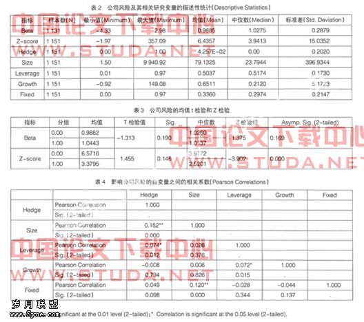 表 2是混合样本的研究变量的描述性统计。全部样本公司的系统风险均值为0.9885,这是由于剔除了ST公司而略低于市场风险。Z-score的均值(中位数)为6.4357(3.9413),表明样本公司的破产风险较低。资产规模的均值为79.1325亿元,高于沈艺峰、江伟(2007)的资产规模均值15.6320亿元。资产负债率的均值为50.37%,比沈艺峰、江伟(2007)的资产负债率均值47.33%和徐向艺、张立达(2008)的资产负债率均值49.1%略高,低于马连福、陈德球、高丽(2007)的以2005年205家家族上市公司资产负债率均值57.07%。主营业务收入增长率的均值为65.11%,高于沈艺峰、江伟(2007)的主营业务收入增长率均值23.61%和刘伟、刘星(2008)的2004年403家制造业公司的主营业务收入增长率均值34.7%,表明我国上市公司水平较快。固定资产比例的均值为33.6%。从各项样本指标来看,样本公司之间的差距较大,这也便于考察公司运用衍生金融工具进行风险管理的决策对公司风险的影响。