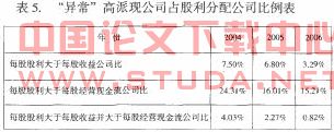 4.股利支付中“异常”高派现行为减少股利支付是一种公司行为,其决定因素有很多,并没有一个统一的衡量标准。根据剩余股利政策理论,公司用来支付给股东的报酬应是一种剩余现金流,如果每股现金股利大于每股经营性现金流量,所出现的现金缺口,会促使其使用以前年度的资金积累或者重新募集资金来弥补。如果采用以前年度的现金余额来弥补,就会减少所有者权益并提高其负债率;如果用发行新股来抵消超额股利,那么公司要承担新股的发行成本;如果通过举债来弥补资金缺口,则提高了公司的负债率,加大财务压力,这些并不符合公司价值最大化原则,所以如果每股股利大于每股收益或每股股利大于经营现金流的情况下上市公司仍分红,我们称为“异常”高派现行为。从表5