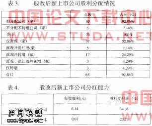 3.股权分置改革后新上市公司分红率高我国股权分置改革实行新老划断,即股改后首次公开发行的公司,其股份不再区分流通股与非流通股,所有股份实行有条件全流通。在统计样本中,共有70家是股改后新上市的公司,当中有65家提出了股利分配方案,占到了92.86%,其中有62家上市公司支付了现金股利,平均每股股利0.14元,高出总体平均水平(0.075)近2倍(见表3、表4)。