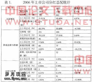 股利政策是公司财务管理的三大决策之一,它决定了流向投资者和留存在公司以图再投资的资金数量,还能够向投资者传递关于公司经营业绩的信息。股利政策主要包括股利政策类型的选择、股利支付率以及股利支付方式的制定等基本内容。由于我国一直存在股权分置造成的“价格分置”和“利益分置”,使我国上市公司在制定股利政策时短期行为严重,主观随意性较大,忽视股利政策与可持续之间的关系。2006年底我国股权分置问题基本得到了解决,出台了一系列旨在完善上市公司治理结构和保护中小投资者的政策法规。在此背景下,我们对上市公司2006年的股利政策进行了统计分析,并了以下几个特征。