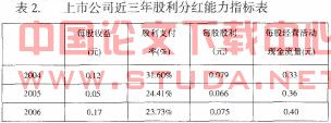 2.上市公司整体派现水平没有随公司盈利能力的大幅提高而大幅提高2006年,在我国快速发展和资本市场制度性改革的带动下,上市公司的业绩实现了大幅度的增长,2006平均每股盈余0.17元,比2005年的0.05提高了2倍多,但2006年上市公司给投资者的现金分红并没有随之大幅增加,从平均每股股利来看,2006年平均每股股利为0.075,比2005年(0.o66)仅提高了19%(见表2)。