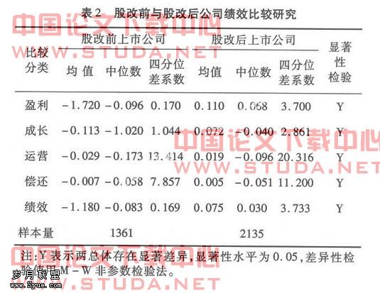 从表2可知,股改前和股改后的上市公司绩效存在明显差异。较之股改前,股改后上市公司的绩效水平有了明显提高;股改前上市公司绩效得分的均值为-1.18,中位数为-0.083,股改后均值为0.075,中位数为0.030。其中,盈利、成长、运营和偿还的得分都由负转正。从离散程度指标四分位差系数值来看,股改后上市公司组内差异增大。总体来说,经过股权分置改革,在上市公司绩效水平得到明显提高的同时,彼此间的差距也在拉大。