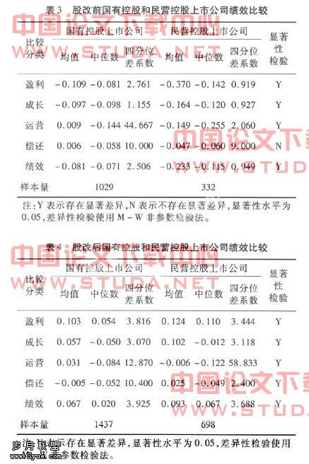 从第二节的统计分析结果可以看出,股权分置改革明显提高了我国上市公司绩效,该结果充分肯定了股权分置改革对上市公司绩效的积极促进作用。第三节的统计分析结果表明,股改前国有控股上市公司的绩效明显优于民营控股上市公司,表明公有产权比私有产权更有效率;而股改以后结果则发生了逆转——国有控股上市公司绩效明显低于民营控股上市公司,这表明在全流通这一新的制度背景下私有产权绩效优于公有产权。股改前后私有产权和公有产权绩效截然不同的表现说明,产权论并非无条件正确,产权改革的成功大大依赖于相应的制度改革和制度安排。