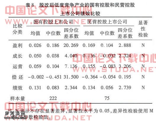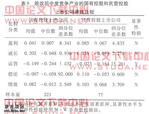 总体而言,股改后在低度竞争和中度竞争行业中,公有产权与私有产权表现无明显差异;但是在高度竞争行业,私有产权绩效明显优于公有产权。